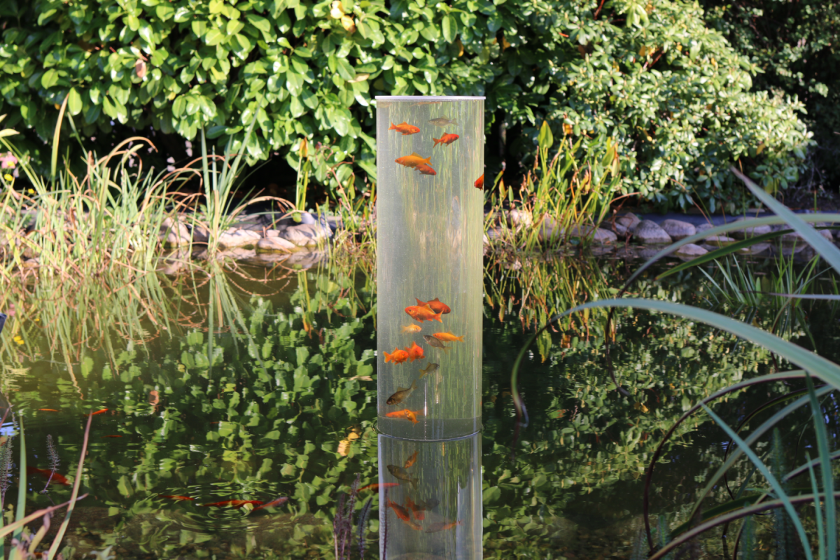 Der Fischturm ist aus hochwertigem Plexiglas® hergestellt. Durch die Verwendung von Plexiglas® entstehen bei Sonneneinstrahlung keine Verfärbungen und die 100% Sichtbarkeit ist gewährleistet (für weitere Infos schaut gern in meinen Blog). In unserem Langzeittest ergaben sich nach drei Jahren Verwendung keine sichtbare Veränderungen. Die Fischsäule muss im Winter aus dem Gartenteich geholt werden!